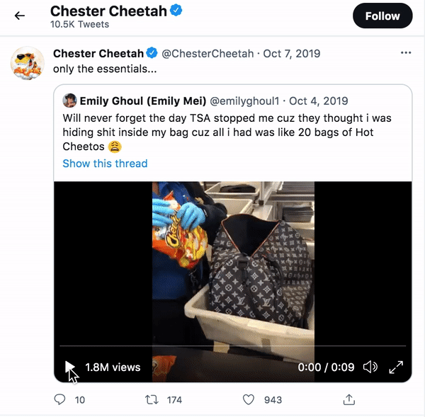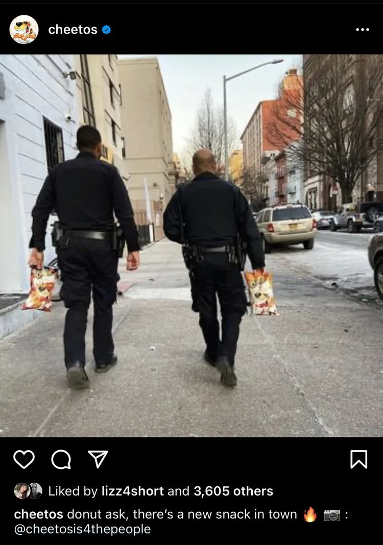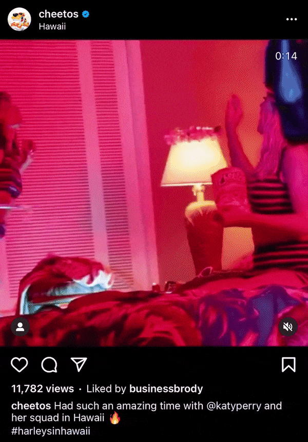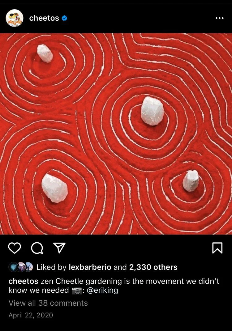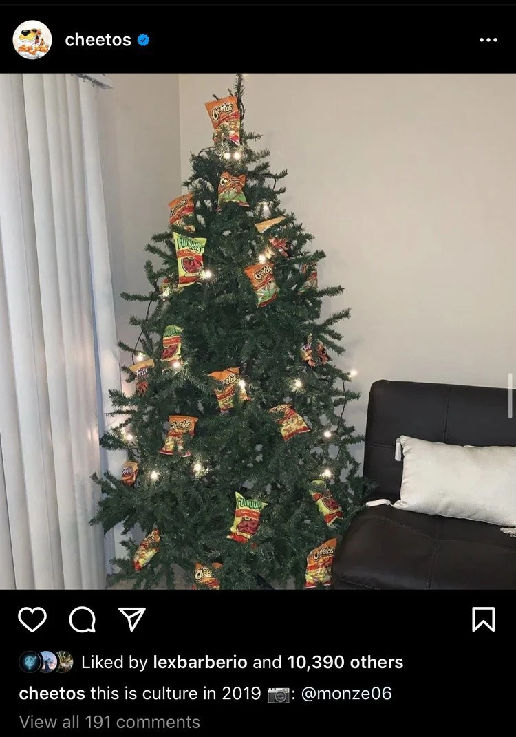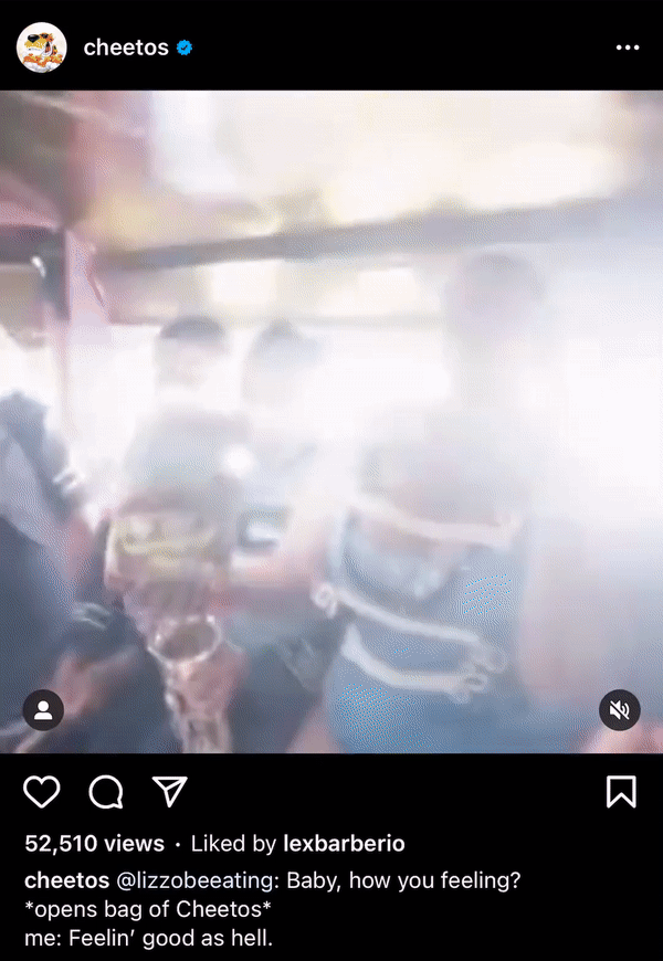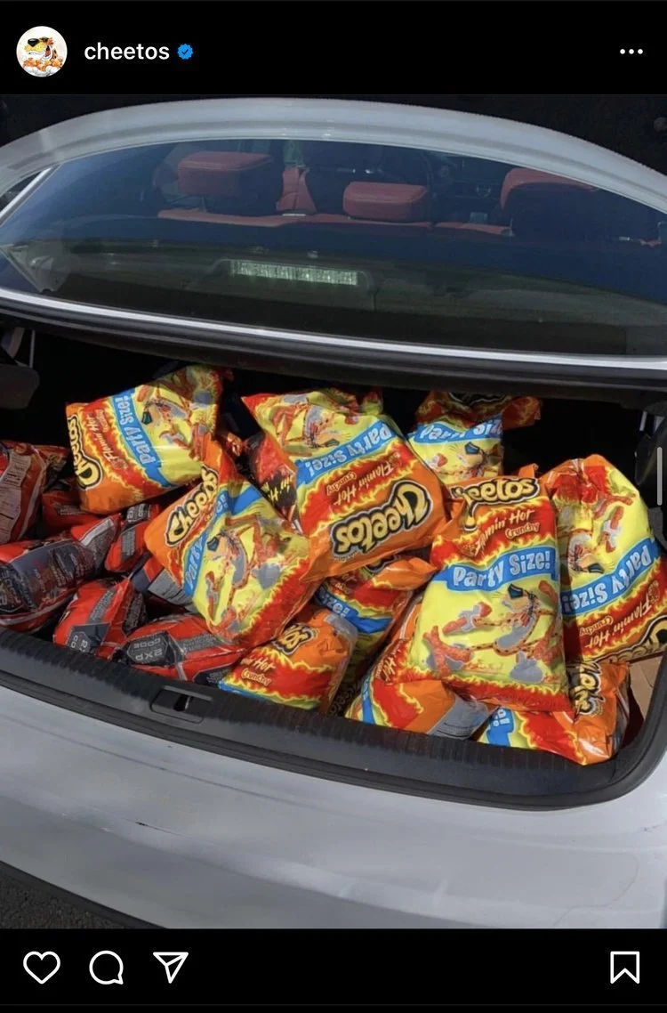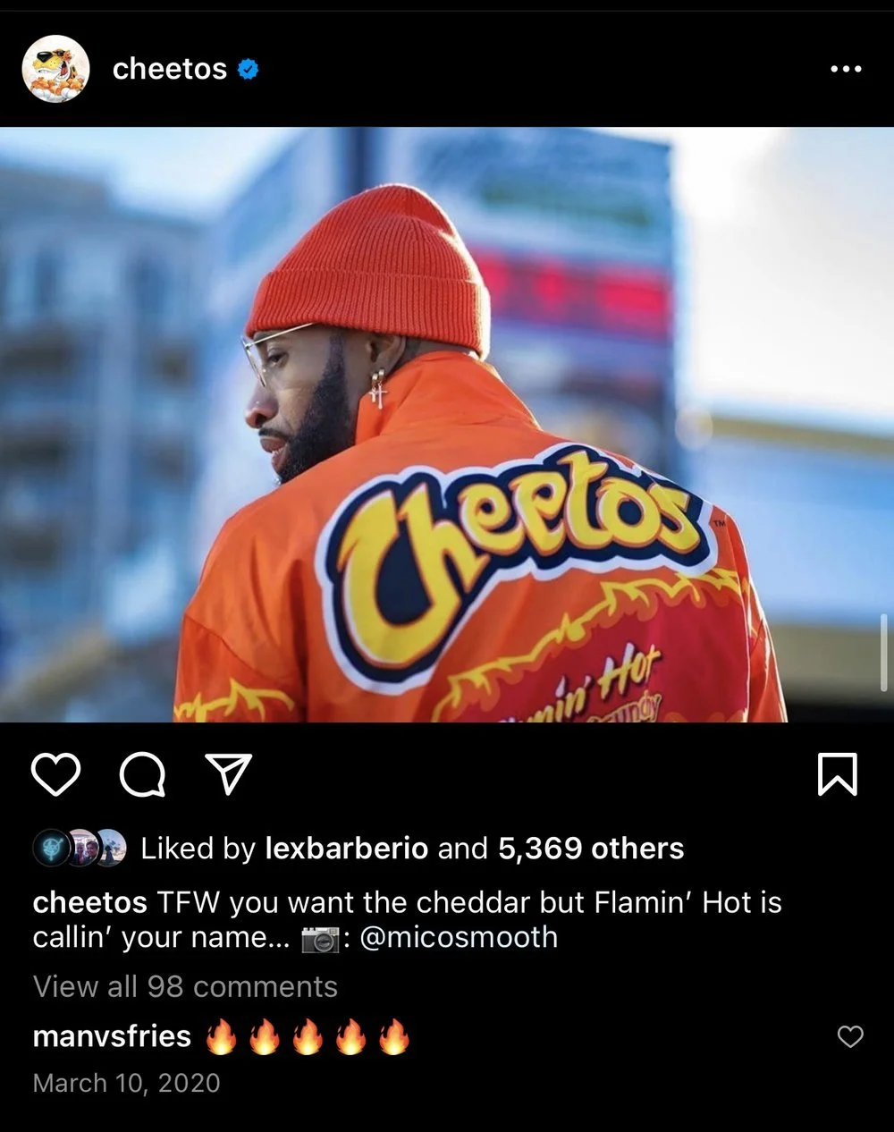 We took over all the Cheetos social media channels in 2019. We doubled their Instagram following, boosted their Twitter following 60% and set up their TikTok which now has 350K followers and billions of views and we never spent a single dollar on paid media. We did it all organically. We fundamentally changed the way Cheetos approached their social, moving away from over produced corporate content and leaning into the robust fan culture of the brand and turned celebrities who love our product into brand ambassadors. As a result Cheetos has never been more ingrained in culture and they have the socials to prove it.