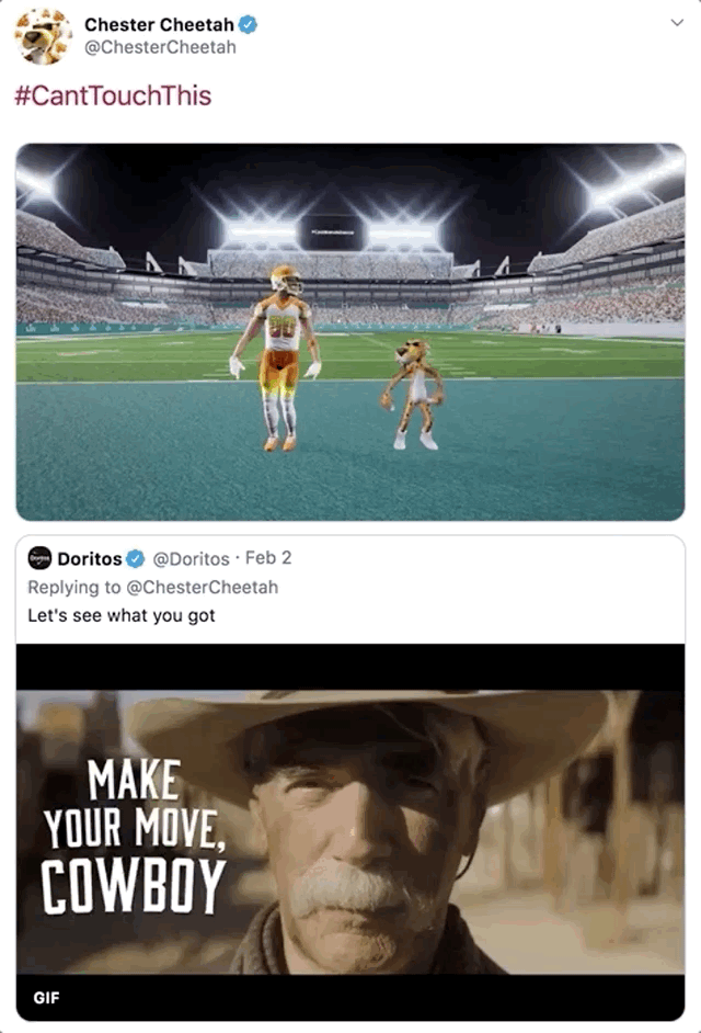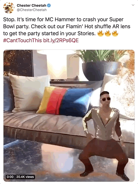We stewarded this brand for a year and spent our time supporting its first Super Bowl spot in a decade, building our community and elevating Cheetos’ place in culture. We interacted with brands and people and created live custom touchdown dance GIFs using a mo-cap studio live during the game. It was a big bite for a busy night but we made it happen and it was a huge success. We finished #10 in brand affinity during The Big Game and all together we got hundreds millions of impressions in the weeks that followed. It marked a reward for a huge risk, and has begun a new era of Cheetos in pop culture and we helped make Cheetos something fans look forward to seeing on Super Bowl Sunday.